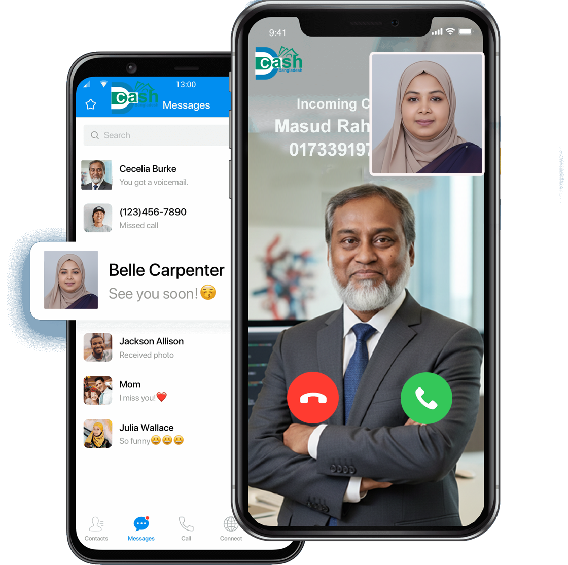 DCash is a mobile app designed for expatriate Bangladeshis, combining communication and financial services in one platform. It enables live chat, voice/video calls, remittance transfer, cashless payments, digital wallet use, and online shopping. A seamless, secure, and complete solution for staying connected and managing money globally.